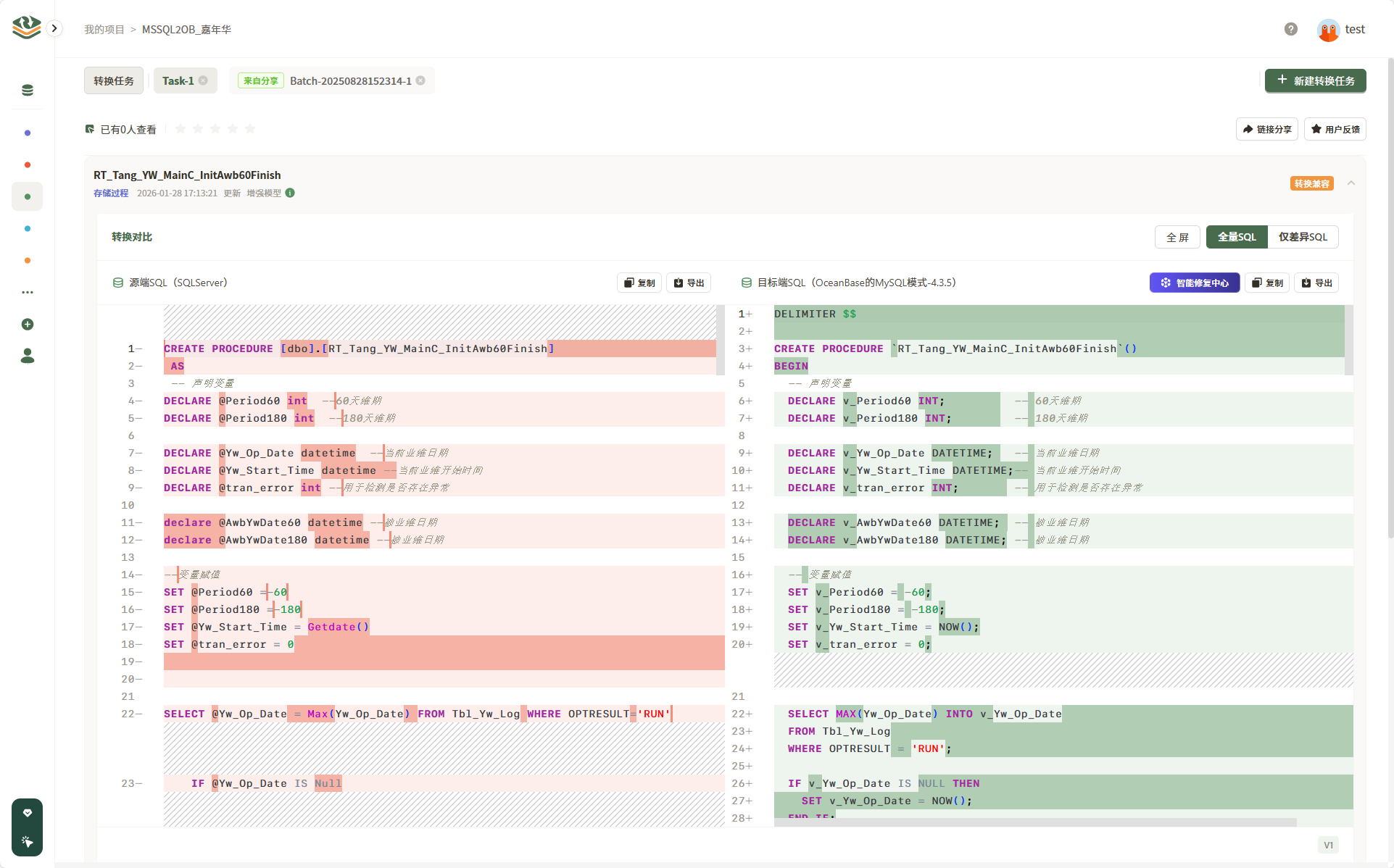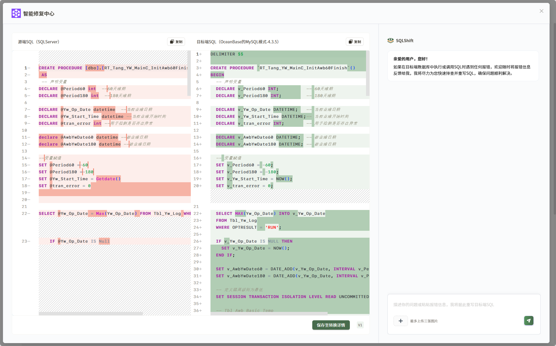 - SQL语法专家模型:动态学习源端和目标端数据库语法规则(如Oracle物化视图→OceanBase等效语法),精准识别语法差异部分。